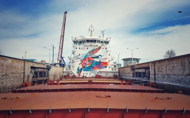 Between mid-February and early March of 2017, four urban Montreal artists worked together to create the mural on the forward façade of the accommodations block of the bulk carrier CSL St-Laurent that depicts a Canada goose with its powerful wings spread in flight, its forward motion a tribute to Montreal and to Canada.